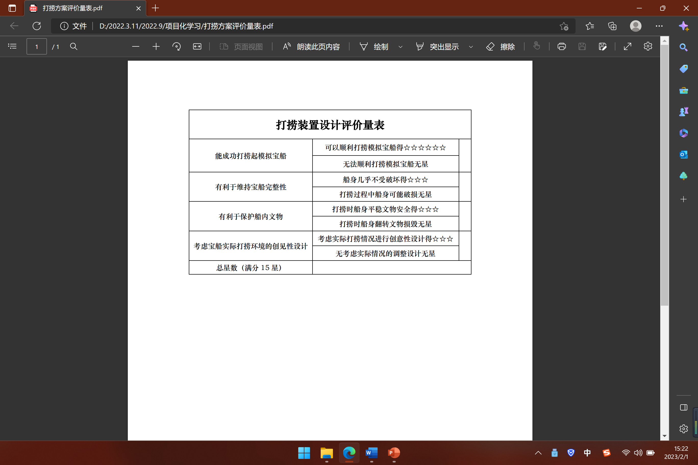 1.过程性评价 以10分为基准分,项目进行过程中按照下表进行加减分,满分25分。 头脑风暴中发言总计0次-5分 1次+0分 2次+2分 2次以上+5分 担任组长+10分 代表小组进行发言或者装置展示 +5分 小组长对组员进行评分0-10分,由组长决定 小组成员互评分0-15分,有小组互评产生 2.终结性评价 (建议含学习成果评价量表、学习素养评价量表) 1、 打捞装置小组互评0-5星记5分;6-10星记10分;11-14星记15分;15星记20分。 2、项目化学习内容相适配的单元练习作业。按照题目评分标准进行给分,共计30分。