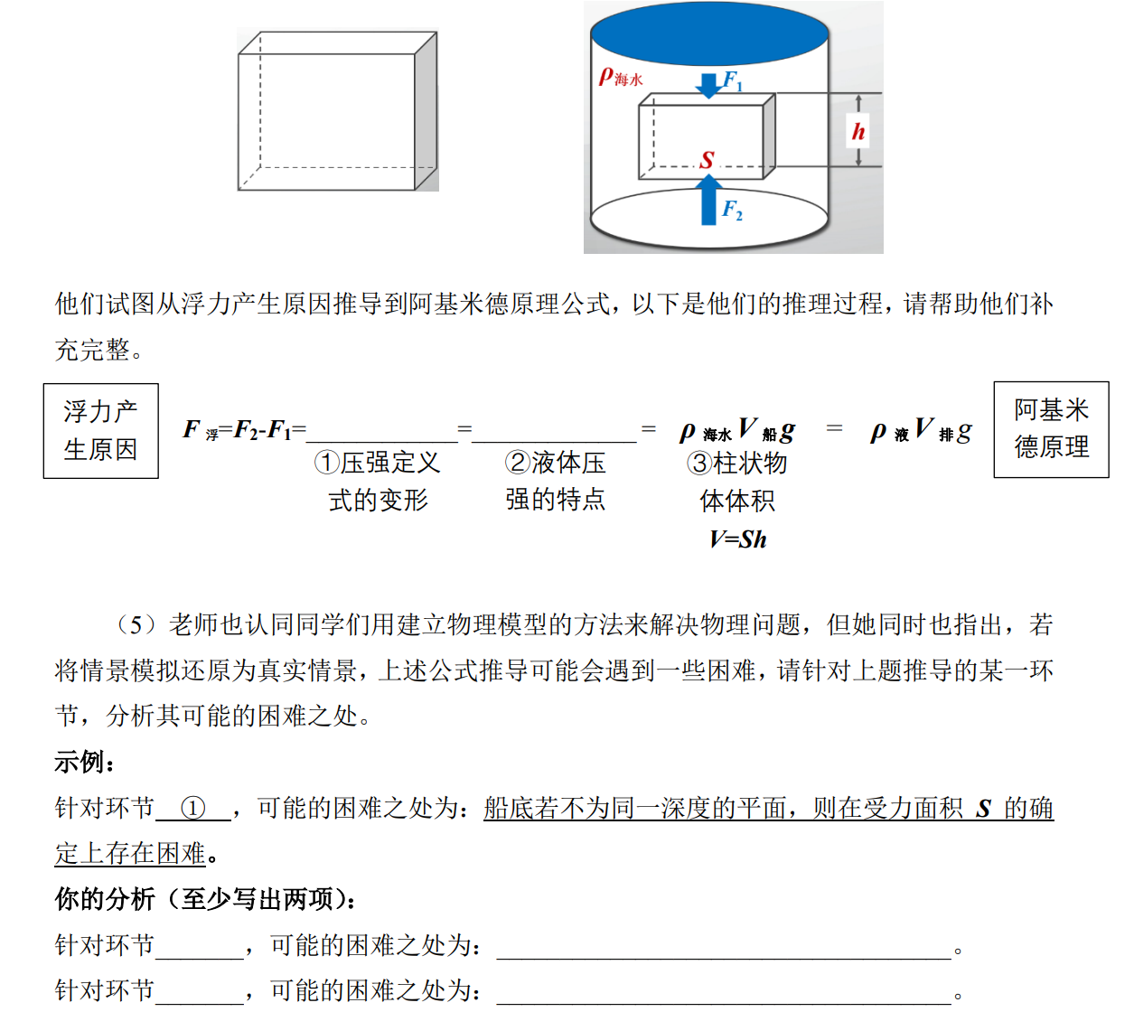 前期调研:国际上现有主流打捞方法调查 情境创设:通过介绍南海一号的故事,帮助学生了解打捞南海一号的价值和意义,告诉学生船舱内藏有大量珍贵的宋代文物,精美绝伦,价值连城,但由于早年中国的古船打捞技术落后,这些文物居然遭到了国际上文物海盗的掠夺,激发完成该项目的使命感。 小组分工:10人为一个小组,其中小组1人 头脑风暴:小组讨论“已有的打捞方案的原理可能是什么?”小组讨论“浮力可能与哪些因素有关?” |
