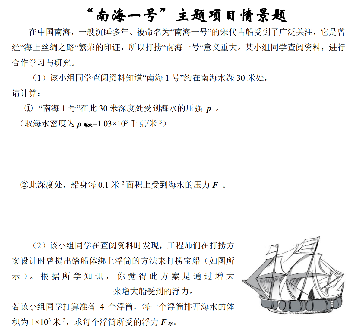 1. 什么是“南海一号”? 2. “南海一号”打捞环境分析。 3. 世界现有的成熟打捞方法有哪些? 4. 各类不同打捞方法背后的物理原理是什么? 5. 设计打捞方案,制作一套打捞模拟宝船的装置。 6. 如何对打捞方案进行展示和模拟实施? 7. 如何评价一套打捞方案并基于评价对打捞方案进行改进?
